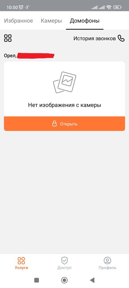 Выберете внизу пункт «Услуги», а затем вверху «Домофоны». Вы должны увидеть картинку перед подъездом. Кликнув на нее переходите на страницу, где видите текущую обстановку перед подъездом, слышите звук, можете открыть подъездную дверь нажав на кнопку «Открыть».